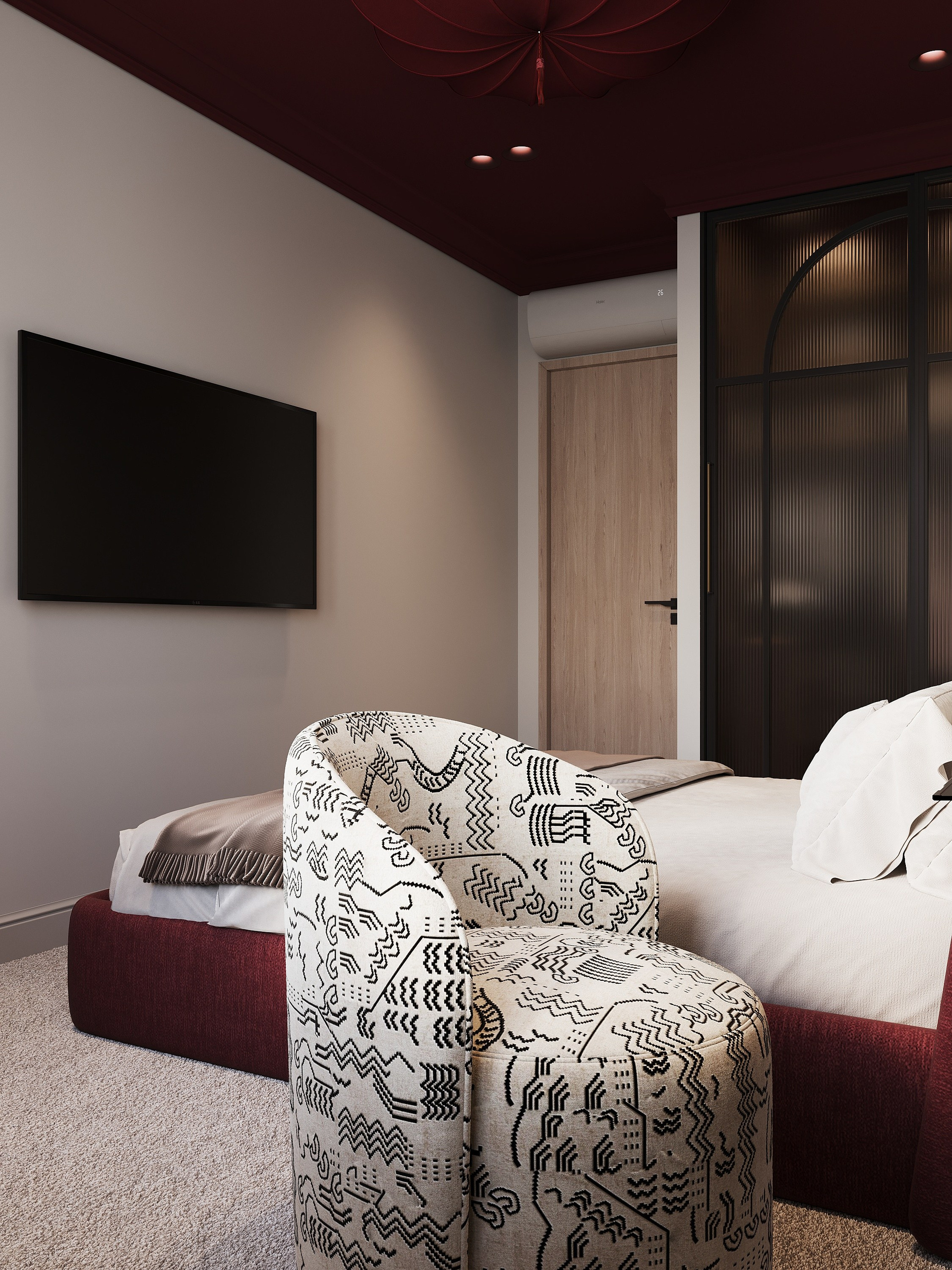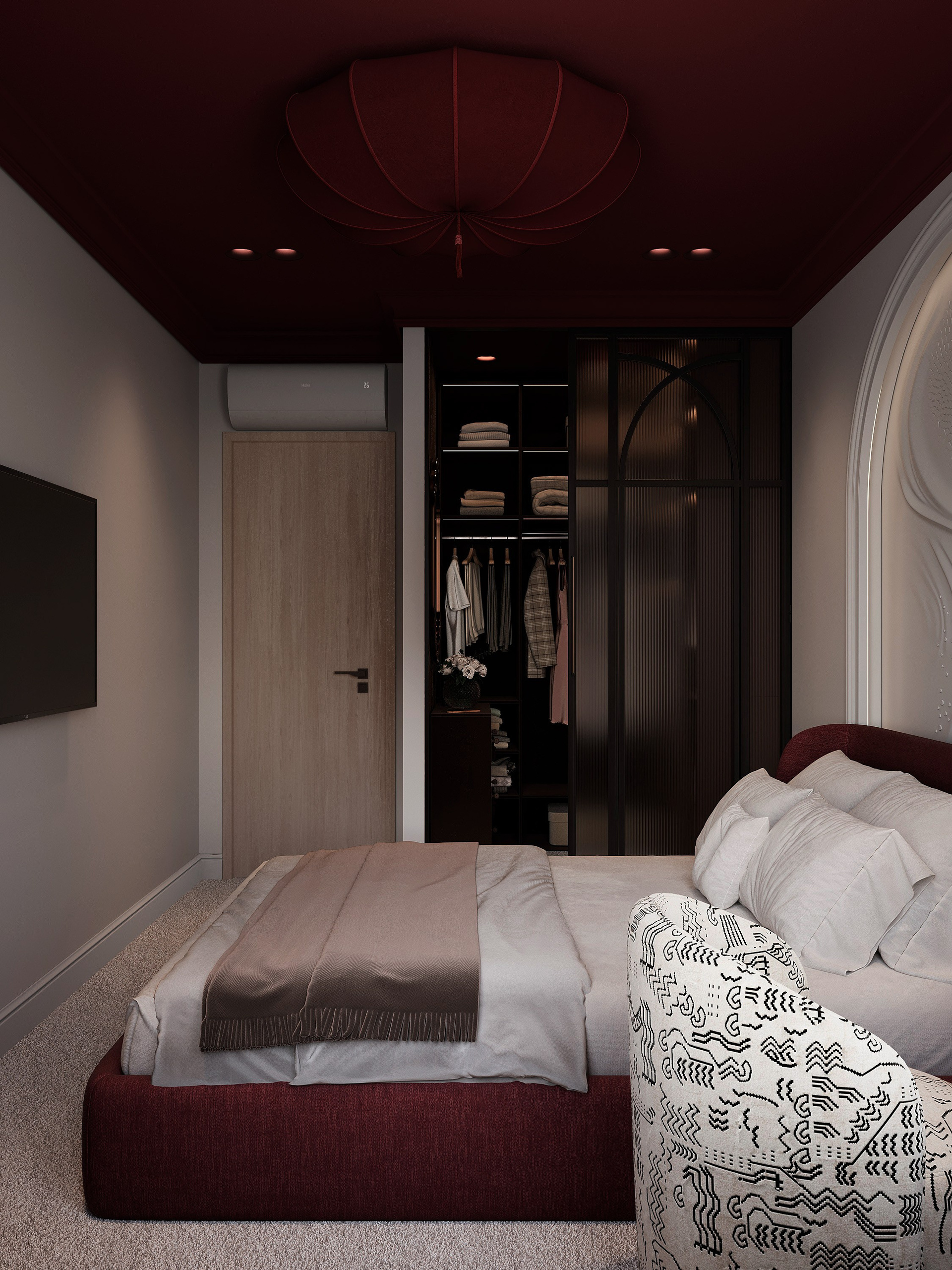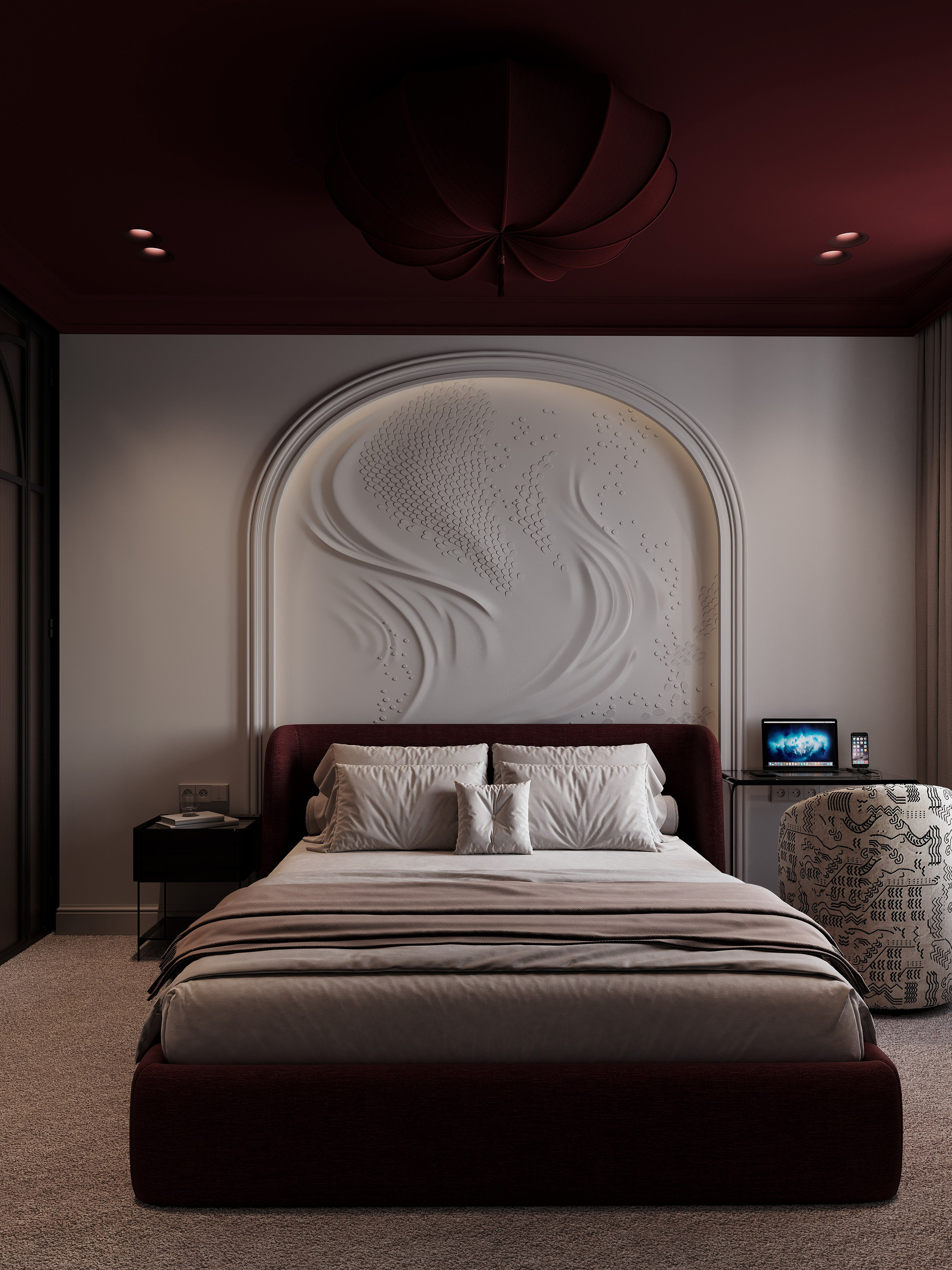 Спальня с бордовым потолком